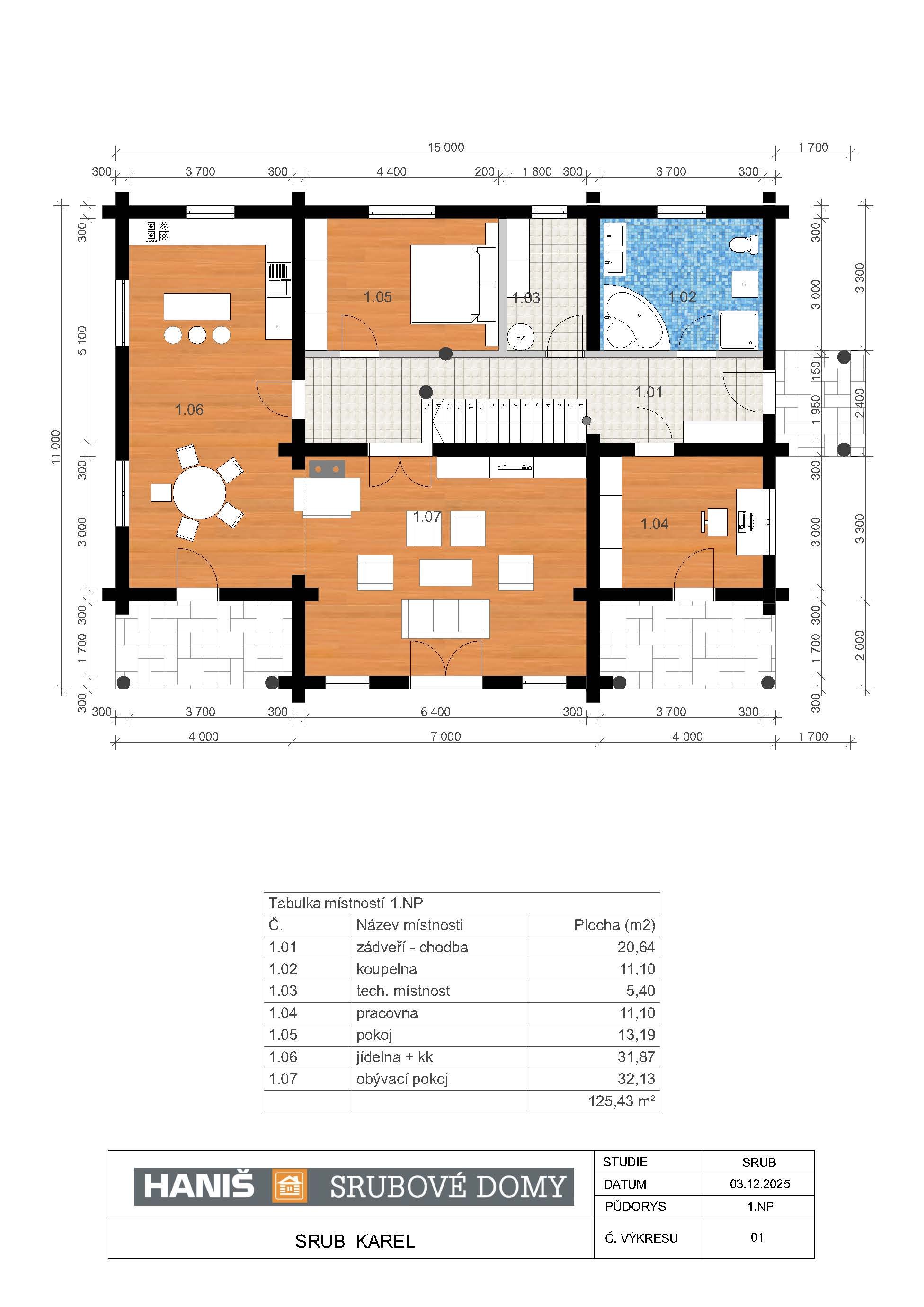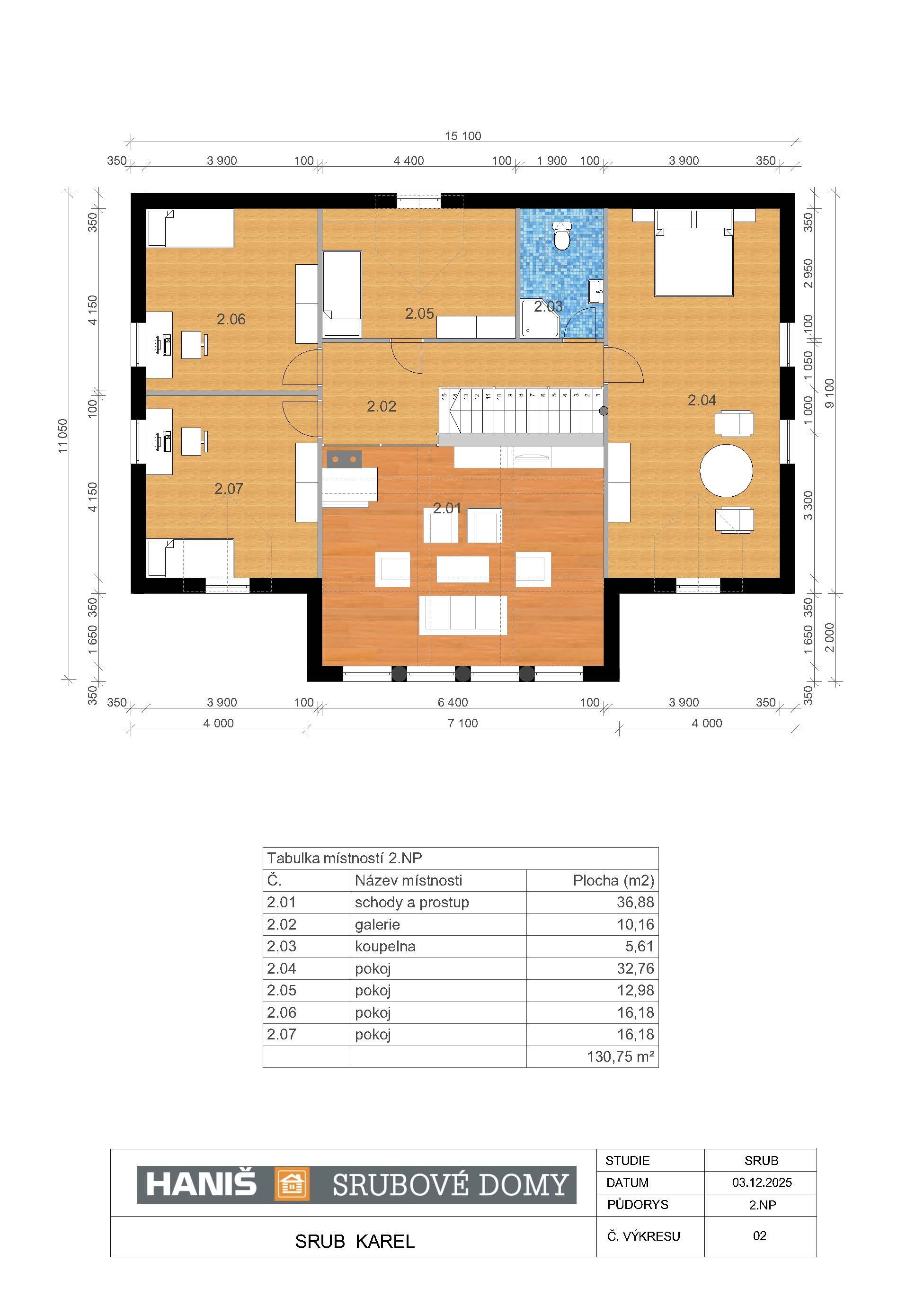 Tento prostorný srub je dispozičně navržen tak, aby splňoval požadavek bydlení až 6. členné rodiny.