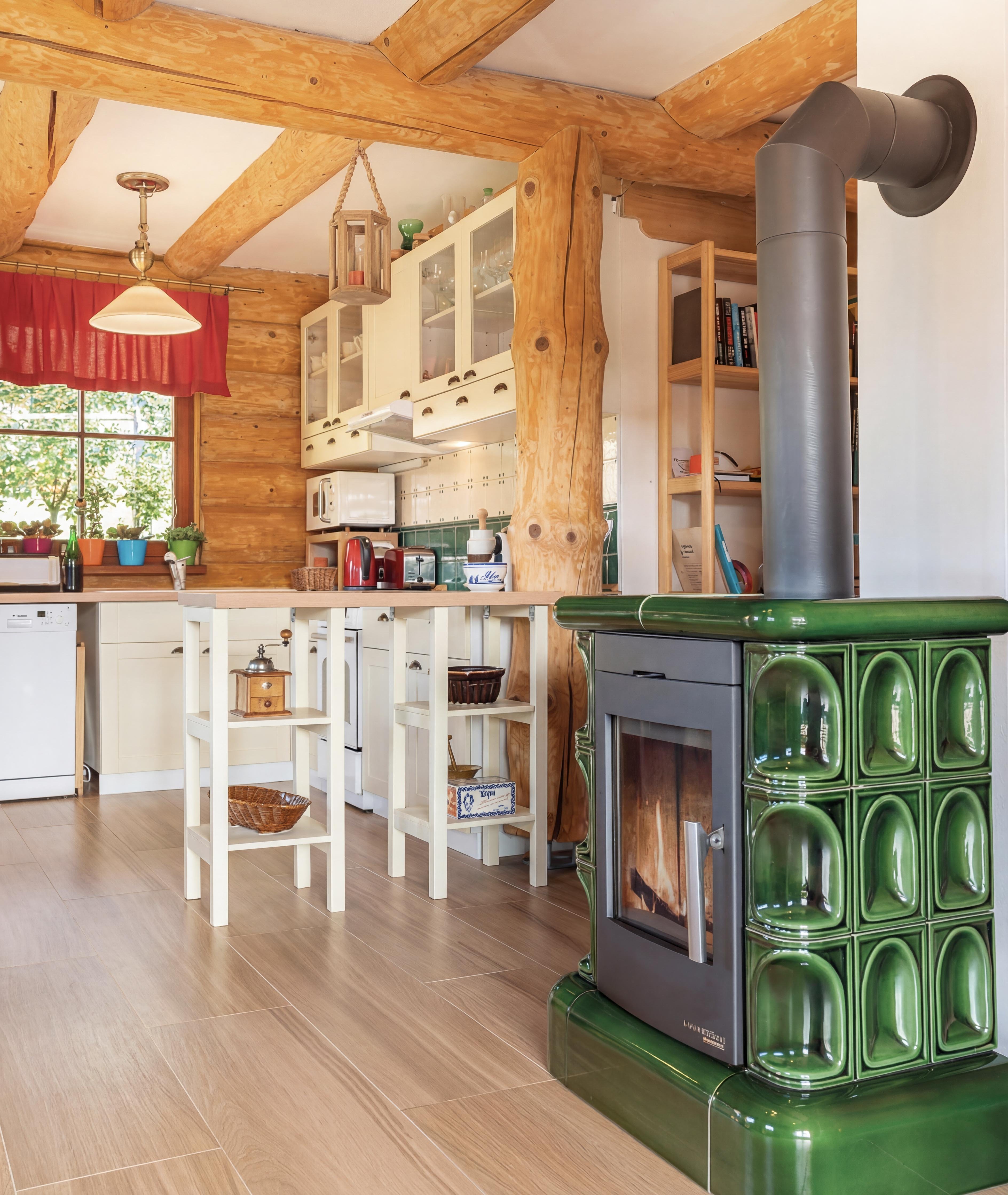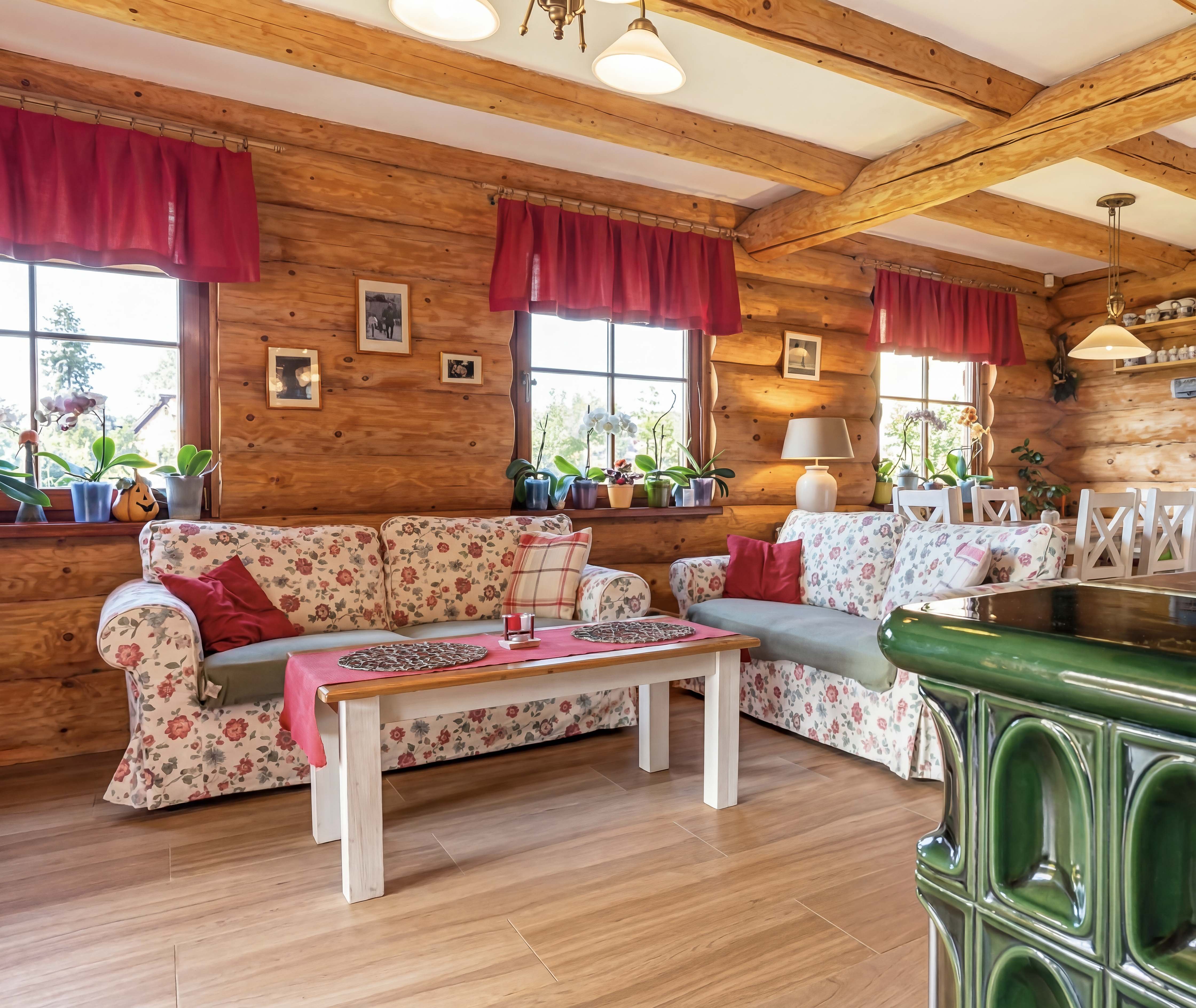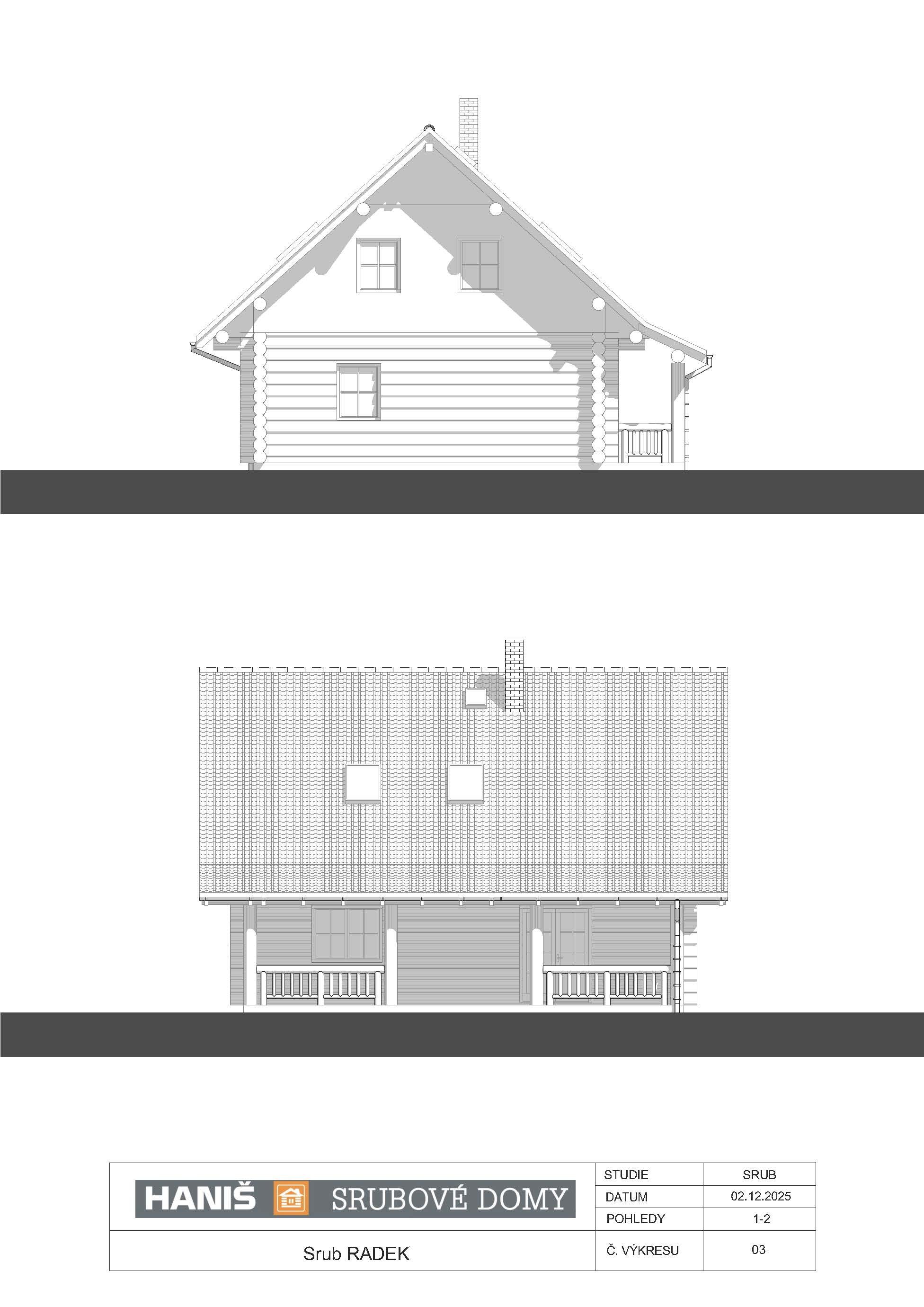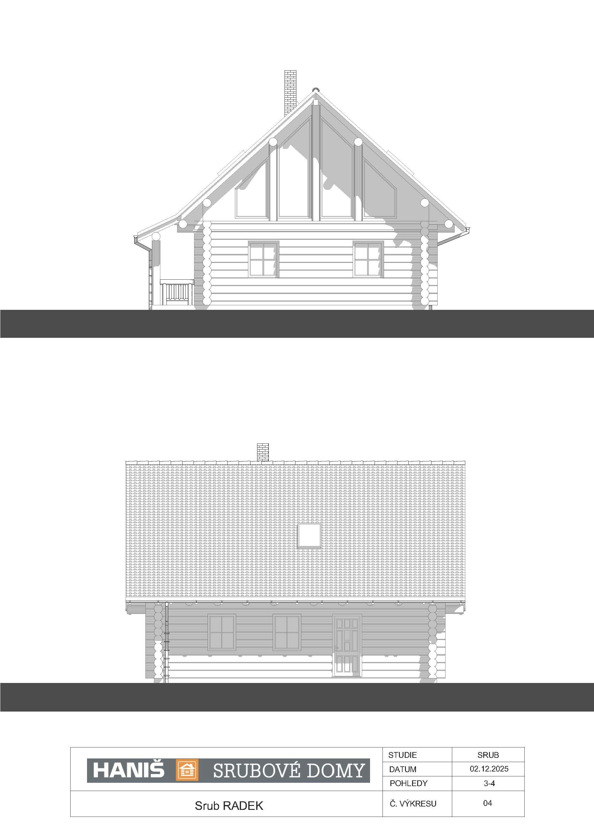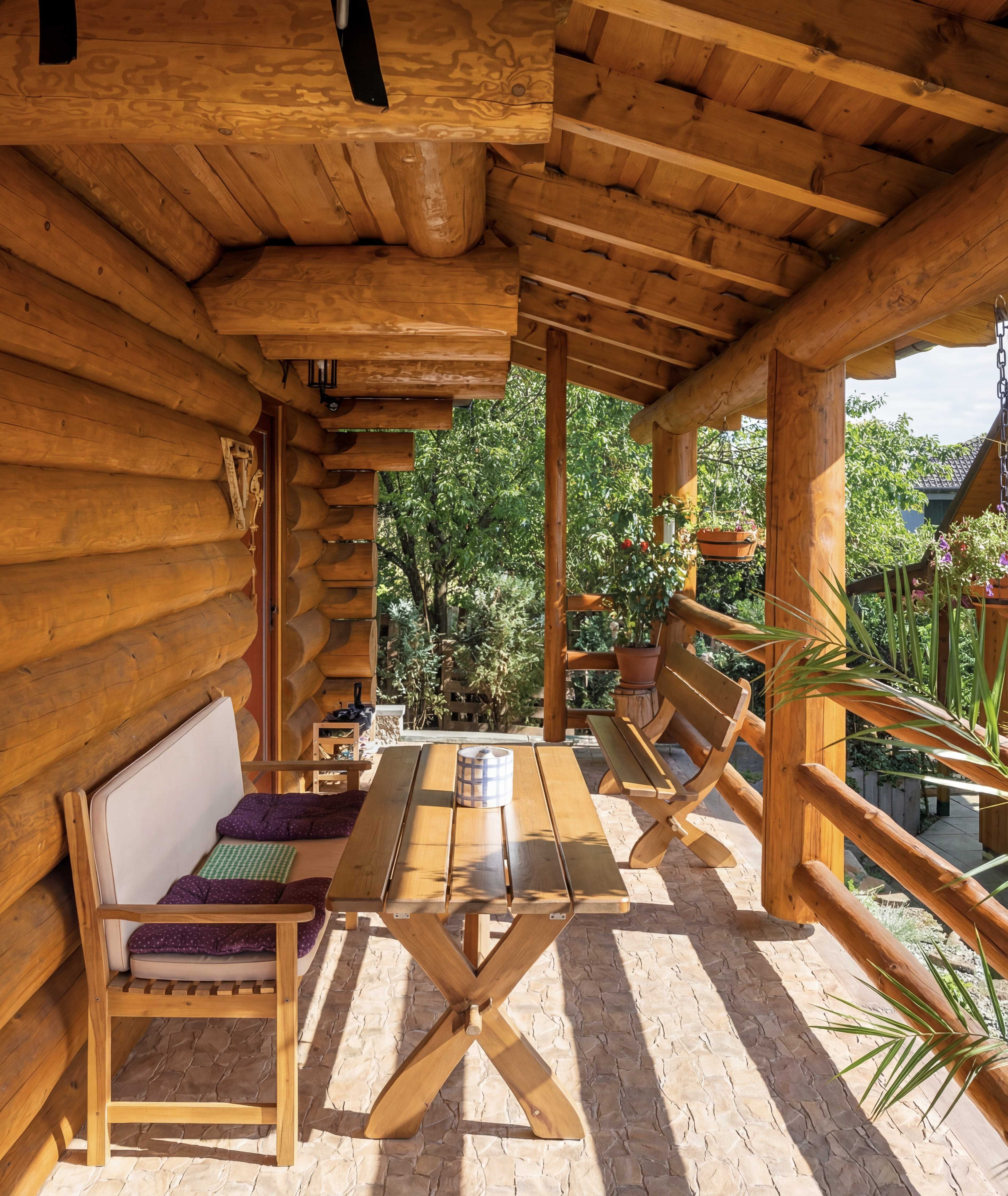 Srub je možné vybavit prosklenými štíty, které od podzimu do jara pomáhají vytápět interiér. V letních měsících, kdy je slunce na obloze vysoko, chrání slunečnímu svitu větší štítové přesahy střechy.